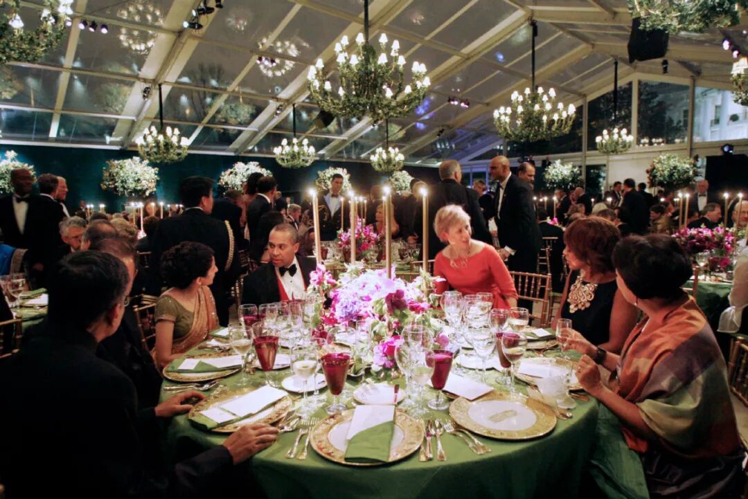 实际上每次国事访问,最让白宫头疼是国宴的前期准备、后续工作。据美国白宫官网消息,首先,开宴前要有美军仪仗队伍在白宫前欢迎,总统和第一夫人在门前迎接,并安排“靠谱的媒体”拍照。接到客人后要先去白宫招待贵宾用的黄色椭圆厅(Yellow Oval Room)喝鸡尾酒、吃甜点。这里就需要对象国大使、国会成员、总统内阁成员、以及社会名流(一般是好莱坞A级影星等)在场。然后又要下楼去大厅,听美国军乐队演奏,才能转移至国宴厅用餐。用餐后,总统一行和客人会被安排在白宫东厢房,观看餐后演出。