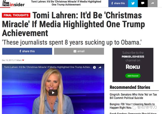 上图:福克斯新闻时事评论员托米·劳伦(Tomi Lahren)12月19日的报道实况截屏。