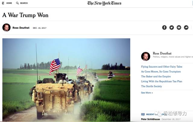 上图:美国军队在库尔德军人的陪伴下,正行进在靠近土耳其边界的北叙利亚地区。12月17日,在大选期间支持希拉里的《纽约时报》专栏作家罗斯·杜塔特(Ross Douthat)发表《川普打的一场胜仗》(A War Trump Won),盛赞川普上任不到一年就赢得了对抗IS的战争,令他惊奇不已。Ross Douthat以此图表明美国在叙利亚的胜利,伊斯兰国的崩溃(来源:截屏)。