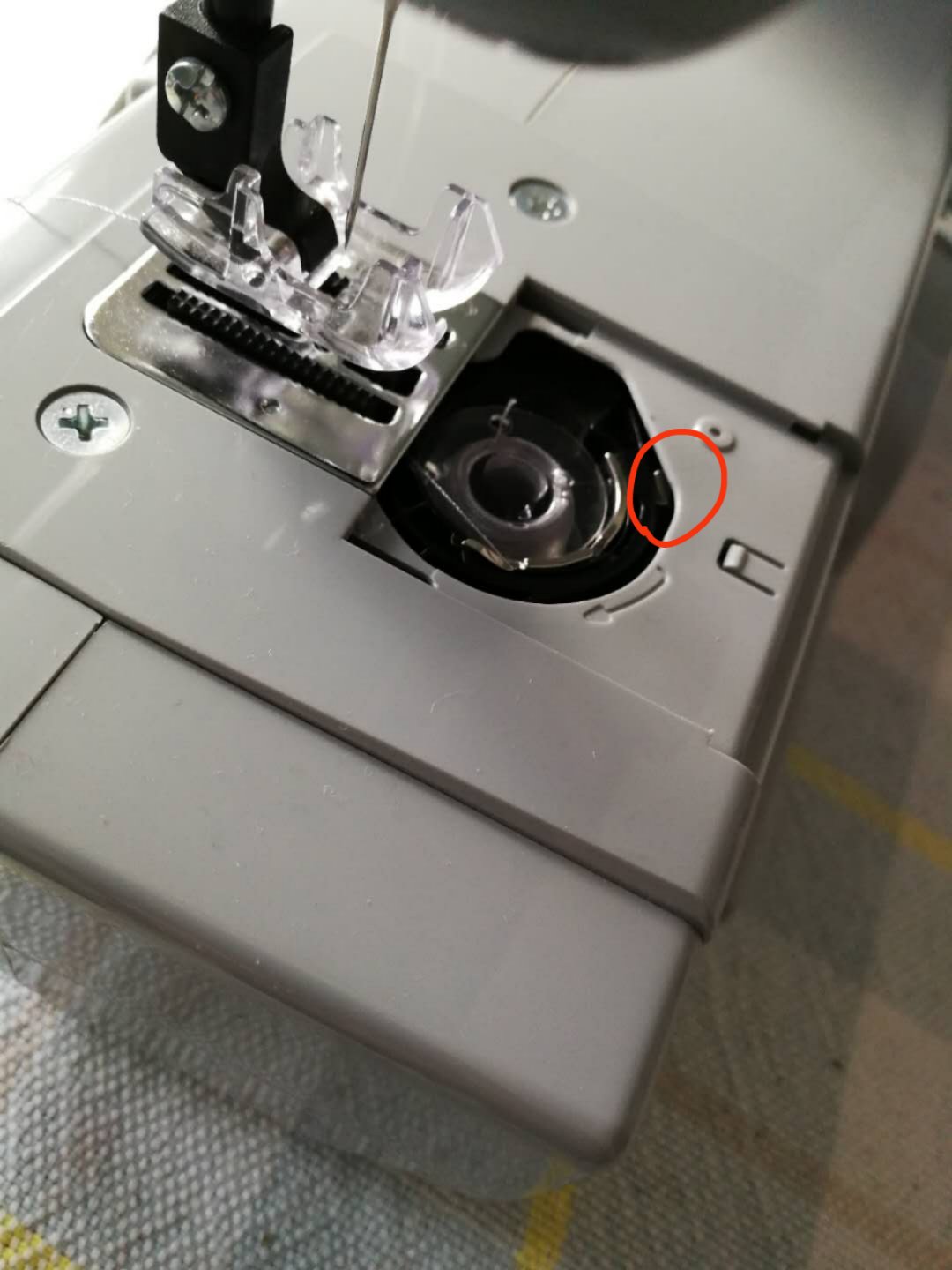 图中圈起来的地方有一小块铁皮,是附着在上面挡板的,每次拉线,线都卡在此处,本应该把它用老虎钳夹紧一些,它就不再挡住线的路线了。但我等不及,用镊子人为将线拔过去一次,底线就成功被拉上去了,然后就成功了。
